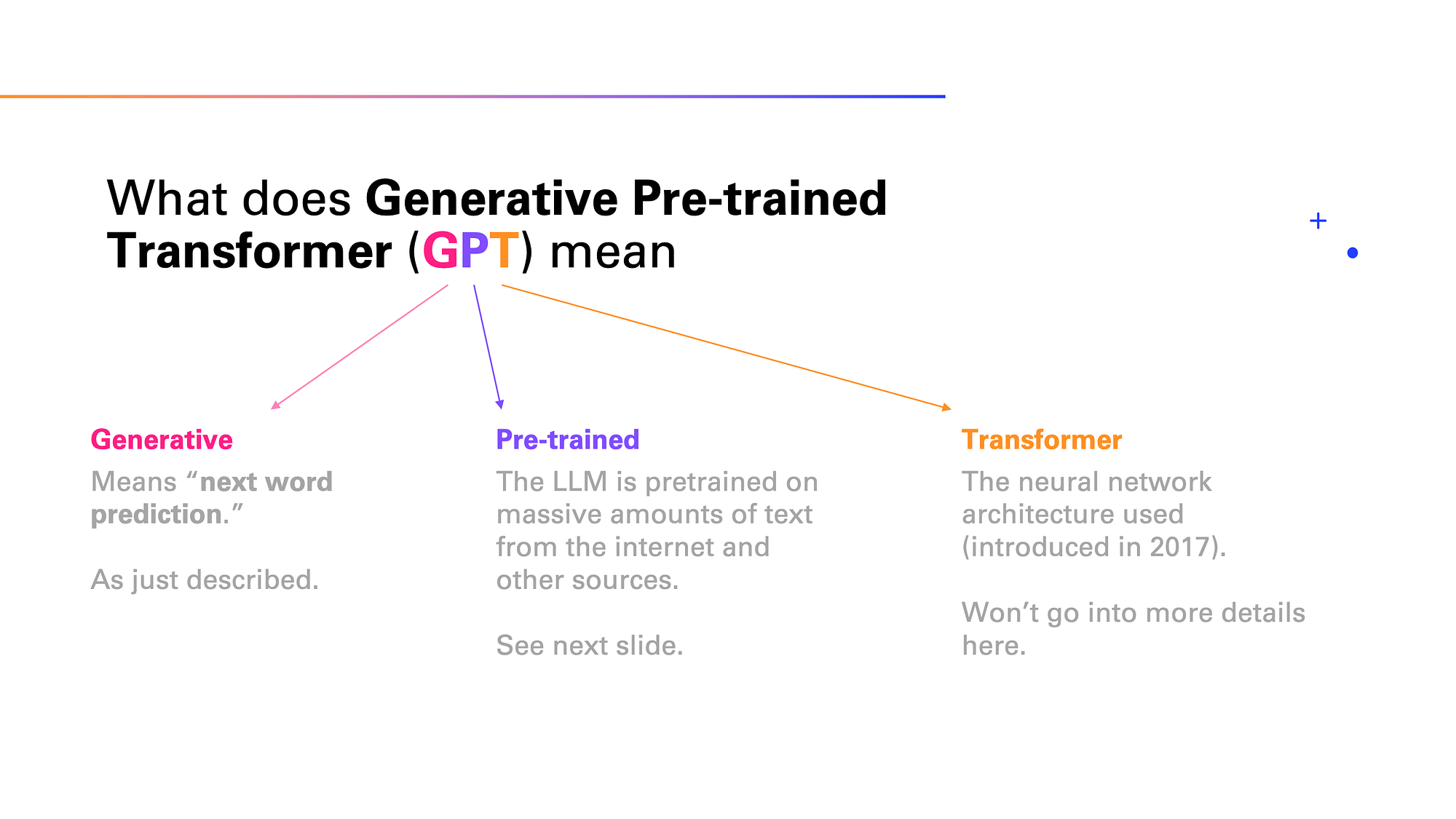 这里我们先简单介绍一下 “T”, 它代表 “Transformer” —— 不是电影中的那个(抱歉),而只是所使用的神经网络架构的类型。这不应困扰我们,但如果你好奇,并且只想了解它的主要优点,那就是 Transformer 架构可以很好地工作,因为它能够将注意力集中在任何时刻都最相关的输入序列部分。你可以说这与人类的工作方式类似。我们也需要将注意力集中在与任务最相关的事情上,并忽略其余部分。